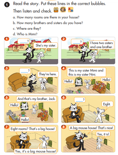 Bài 1. Read the story. Put these lines in the correct bubbles. Then listen and check. (Đọc câu chuyện. Điền những phần còn thiếu vào khung hội thoại cho đúng. Sau đó nghe và kiểm tra lại).